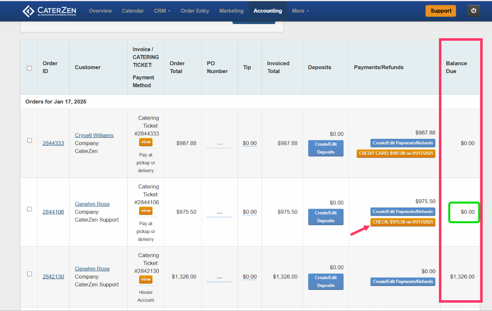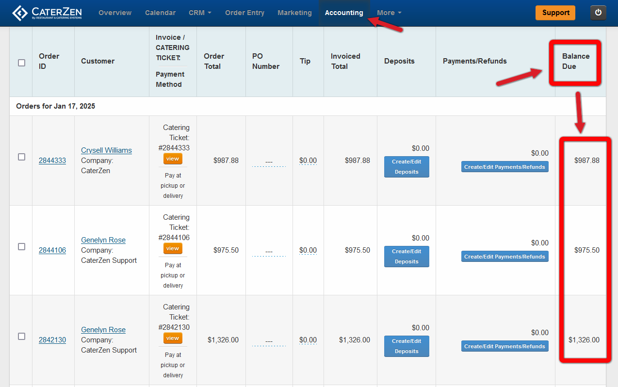 • Go to the Accounting Tab, click Invoices/Catering Tickets, and filter by today’s date. You’ll     see a list of all orders, including their payment statuses. At the far right under the Balance Due column, you see this order has a balance that has not been paid.