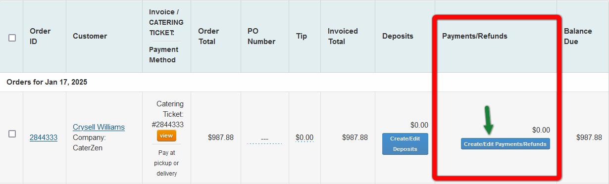 • Find the customer’s order. Under the Payments/Refunds Column, Select Create/Edit Payments/Refunds.