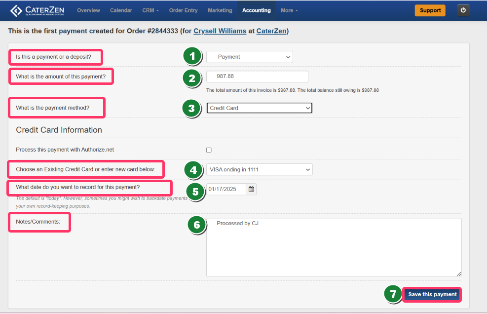 • (7) Save this Payment: Click this once all the correct information has been entered.