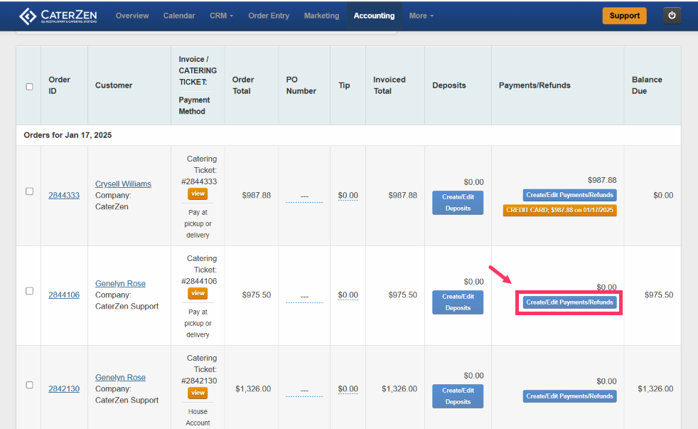 • Find the unpaid order in the Accounting Tab, click Invoices/Catering Tickets, and filter by today’s date.