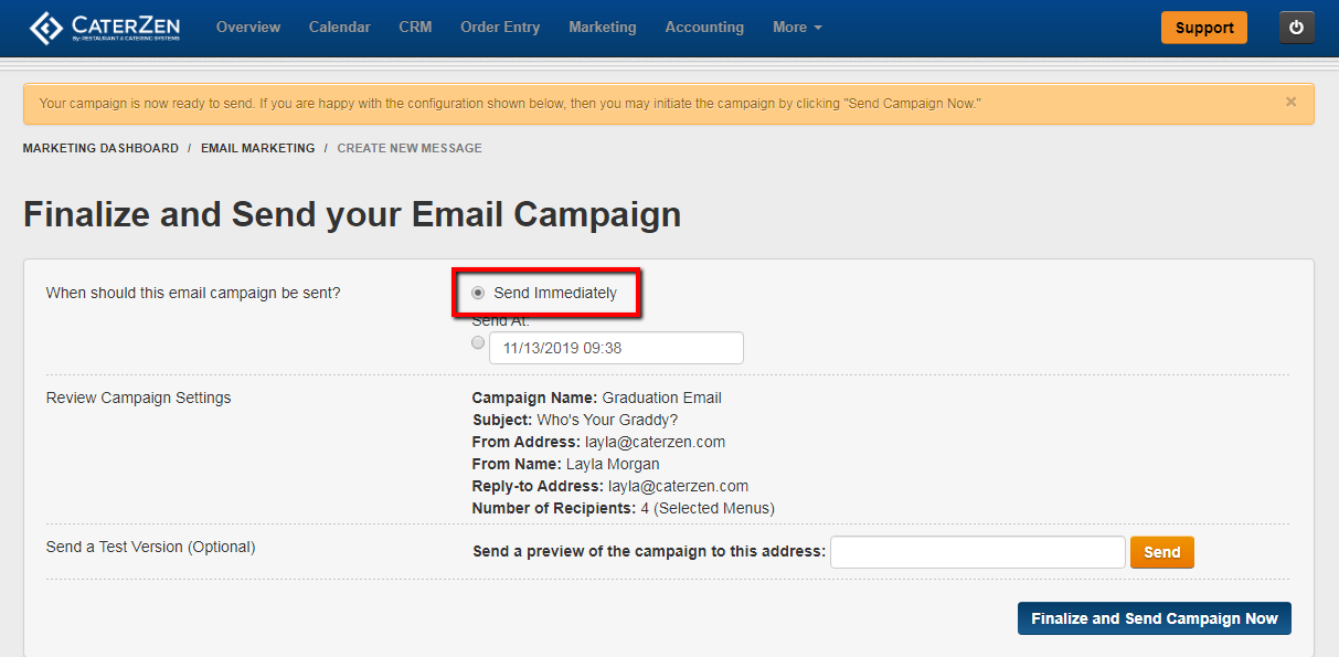 21. Once you have reviewed your email campaign, hit Finalize and Send Campaign Now to activate it. If you have selected to send your email at a future date and time, this just puts it in the queue to go out at that date and time.