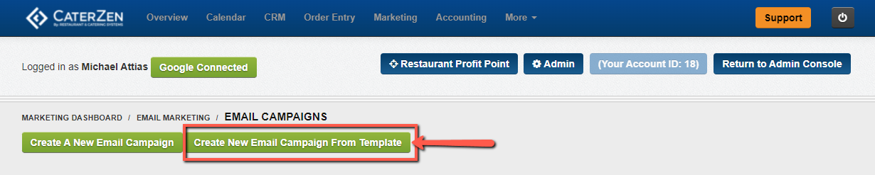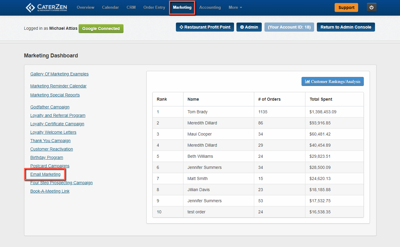 1. Log in to your CaterZen account. Once logged in, go to the Marketing Tab.