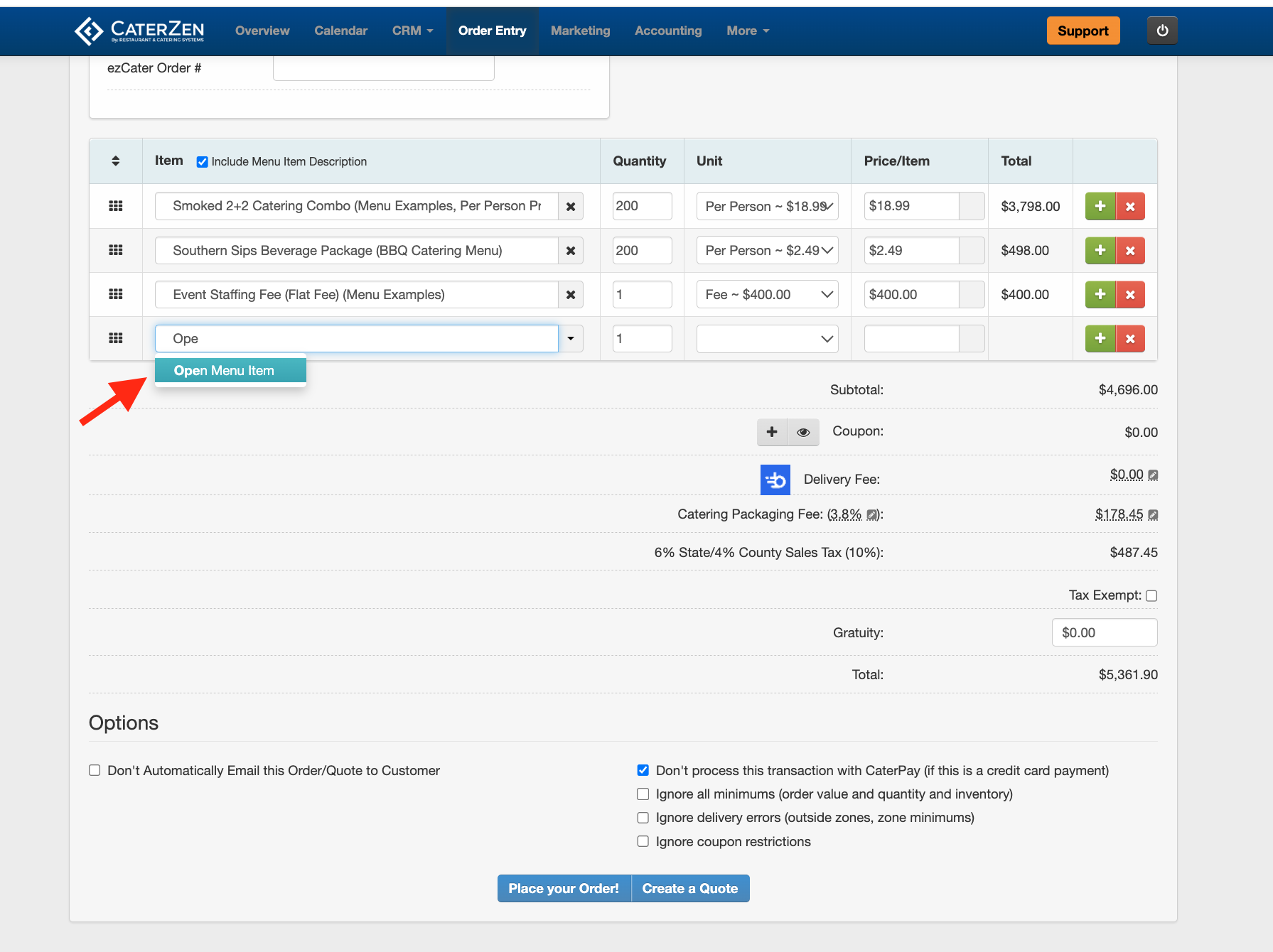 Adding an Open Menu Item to an Order