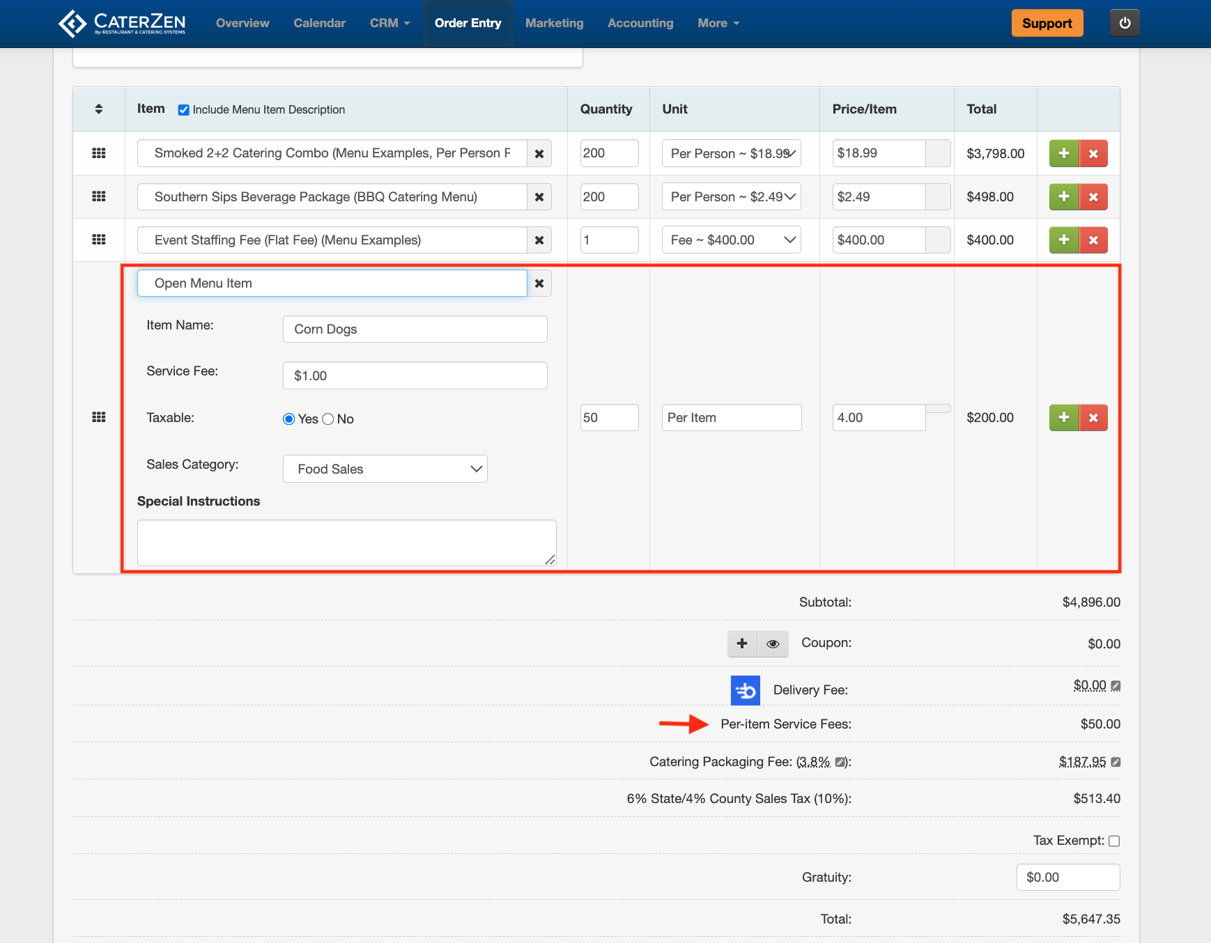 - Service Fee - Enter a flat dollar amount or a percentage. The fee calculates on the item price first, then multiplies by quantity. For example, a $1.00 fee at quantity 50 = $50.00. A 10% fee on a $10.00 item at quantity 5 = $5.00. This fee appears in order totals as "Per-Item Service Fees" and is separate from the Restaurant Service Fees and Custom Order Type Service Fee. See Understanding Service Fees in CaterZen for how all fee types relate to each other.