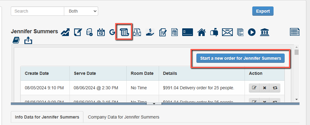 CaterZen's CRM includes a variety of icons to help you efficiently manage client records and navigate key features. Each icon represents a different function, making it easy to access relevant information with just a click. Hovering over any icon will display its name for quick identification.