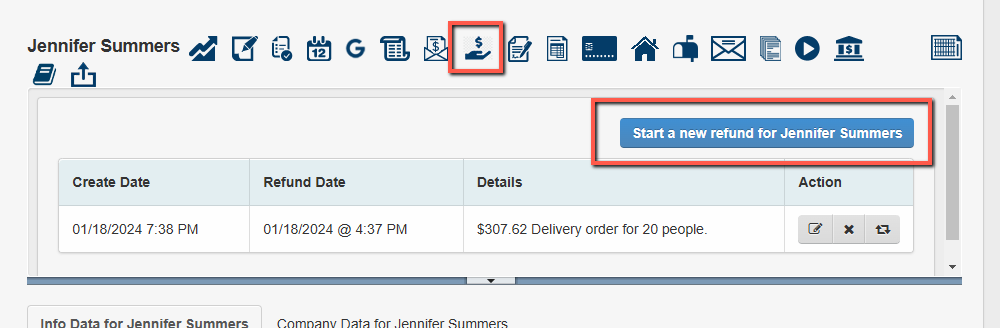 The Refund icon provides a record of all refunds issued to the customer, allowing for easy tracking and management.