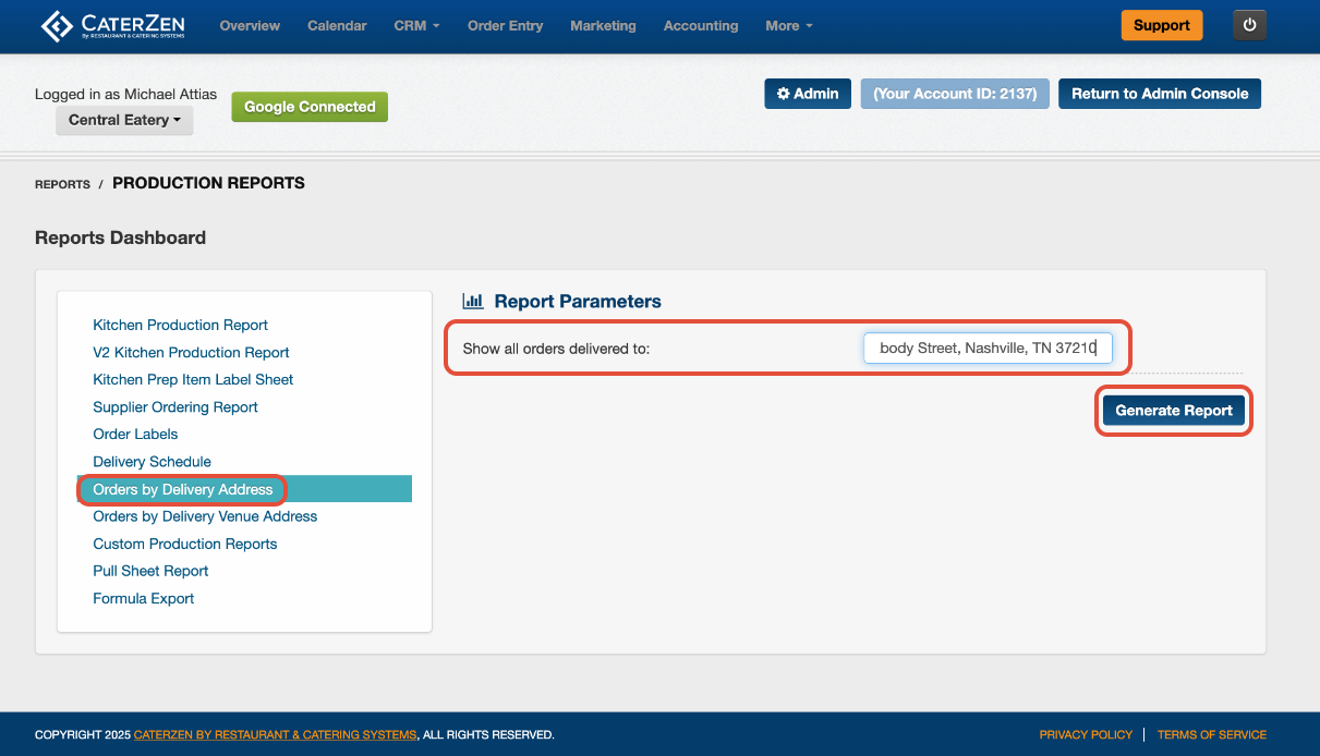 The Orders by Delivery Address Report allows you to view all orders that have been delivered to a specific address. This is especially useful for Customers who deliver repeatedly to the same location and want visibility into order history, frequency, or total spend tied to that address.