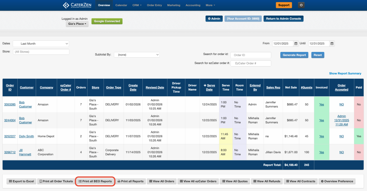 Click Print All BEO Reports