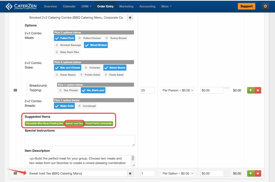 Before adding it to the cart, CaterZen displays recommended add-ons such as: