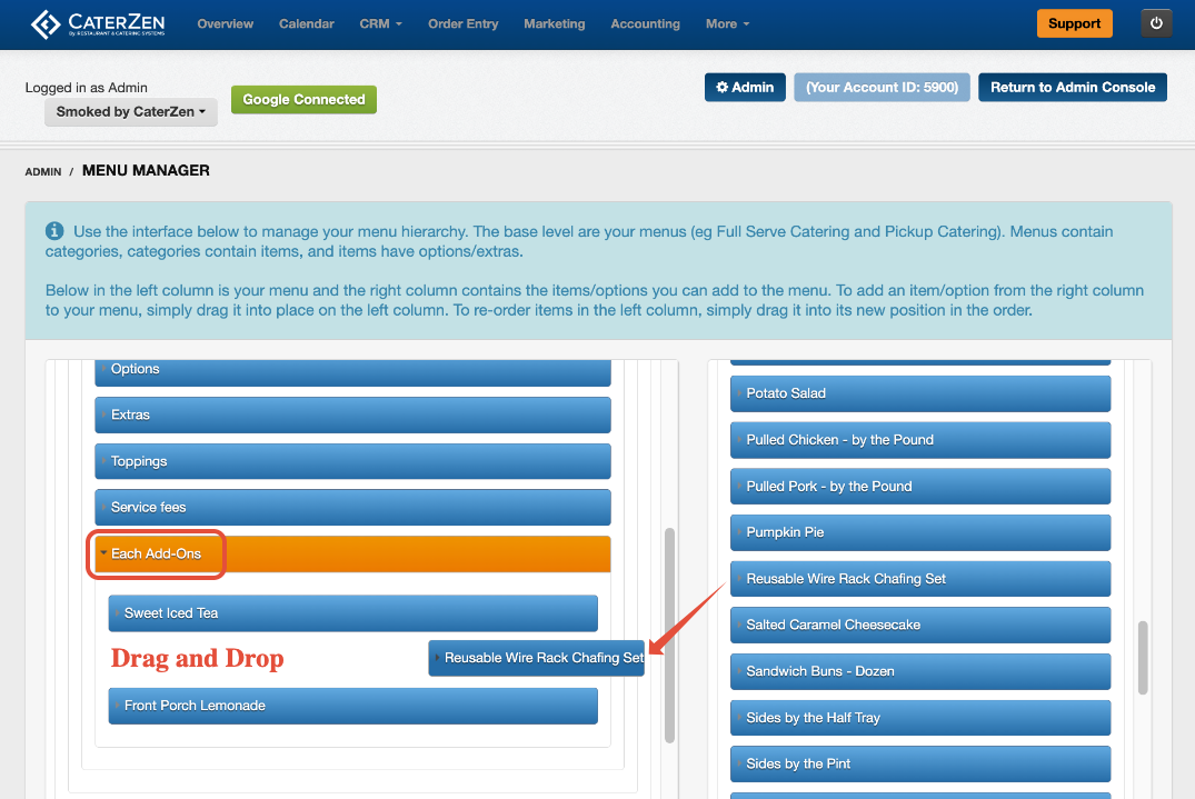 From the right-side Items list, drag the add-on item into the Each Add-Ons area