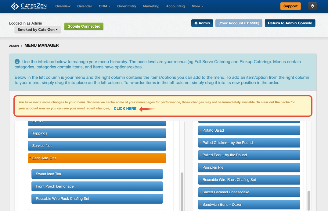 Avoid working in multiple CaterZen tabs while editing in Menu Manager