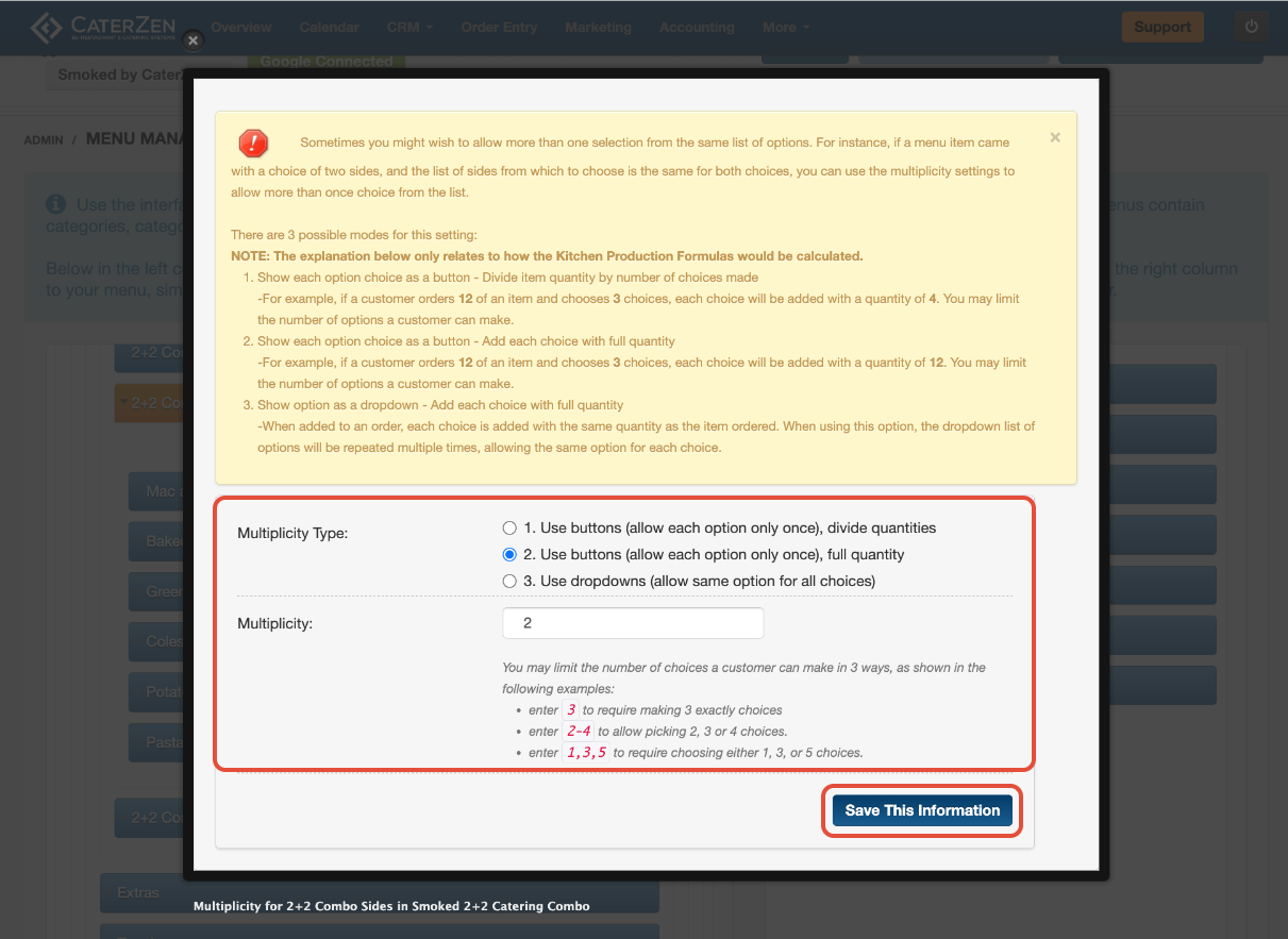 Multiplicity settings control what happens when a menu item requires multiple selections from the same option list.
