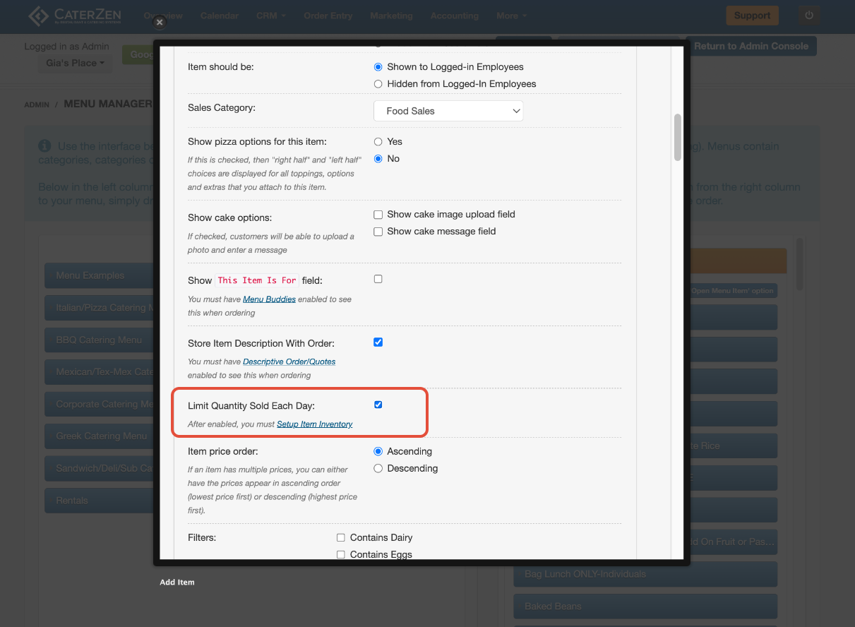 Inventory limits are enabled directly on the menu item.