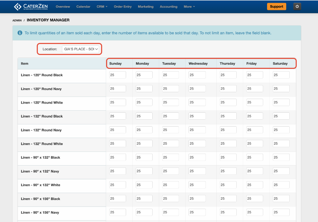 Enter the quantity available for each day of the week