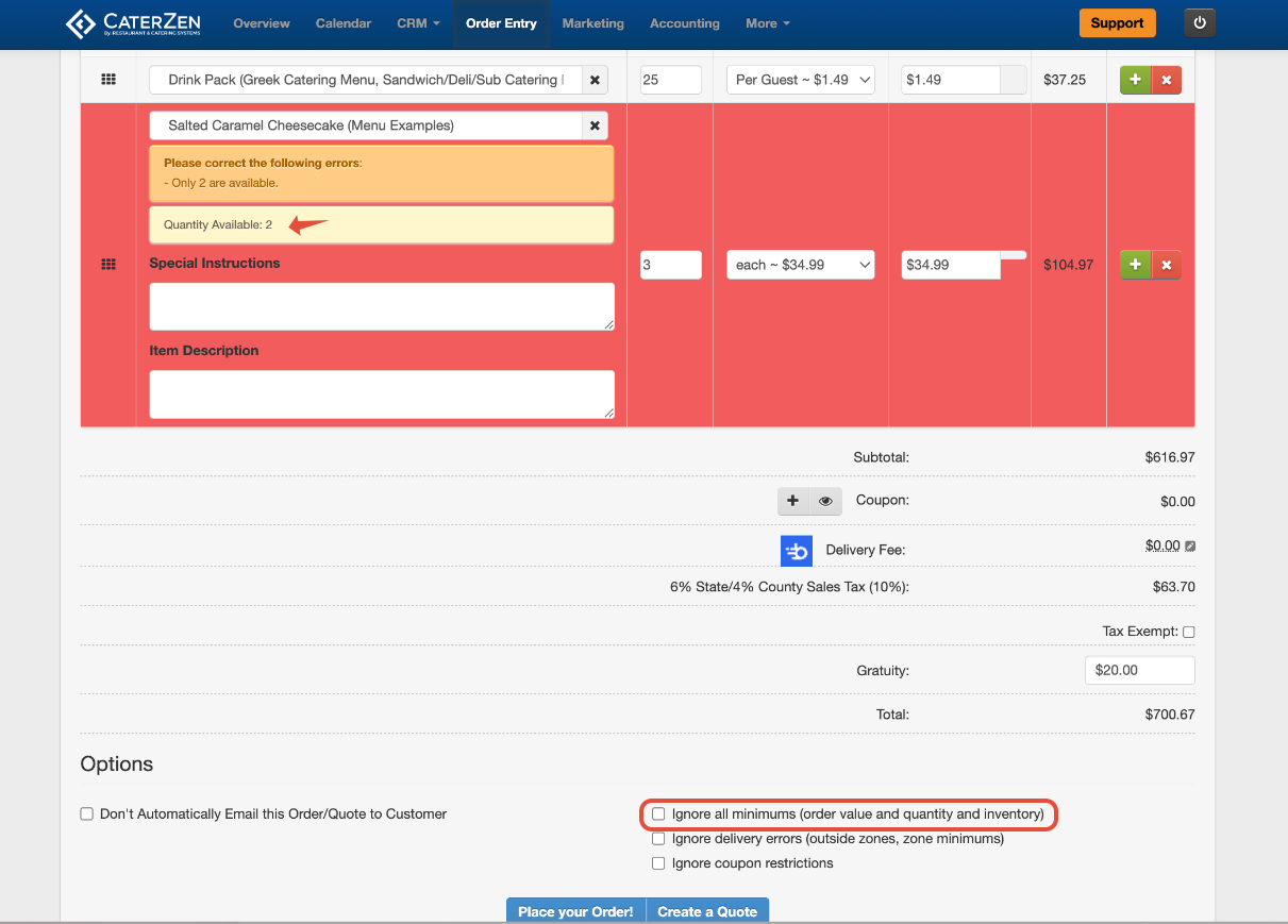 Employees can override inventory limits (if permitted) by checking the box Ignore all minimums (order value and quantity and inventory) This allows flexibility for: