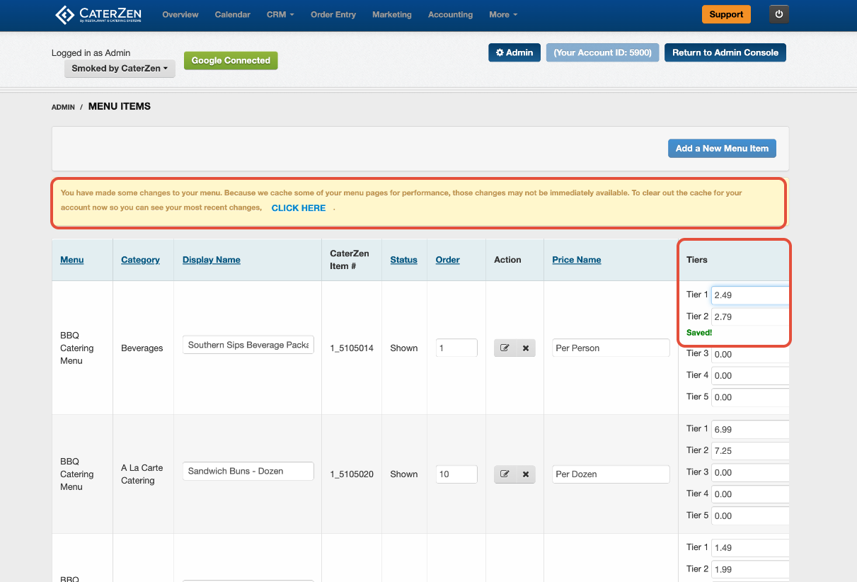 If your account uses multiple tiers, updating the Base Price in the menu item updates Tier One only
