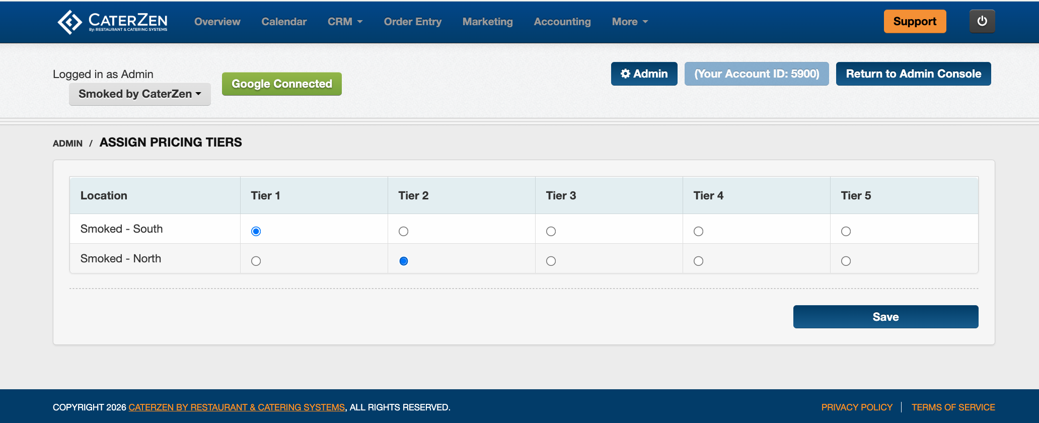 Each location is assigned one pricing tier, and that location automatically uses the prices from its assigned tier during ordering.