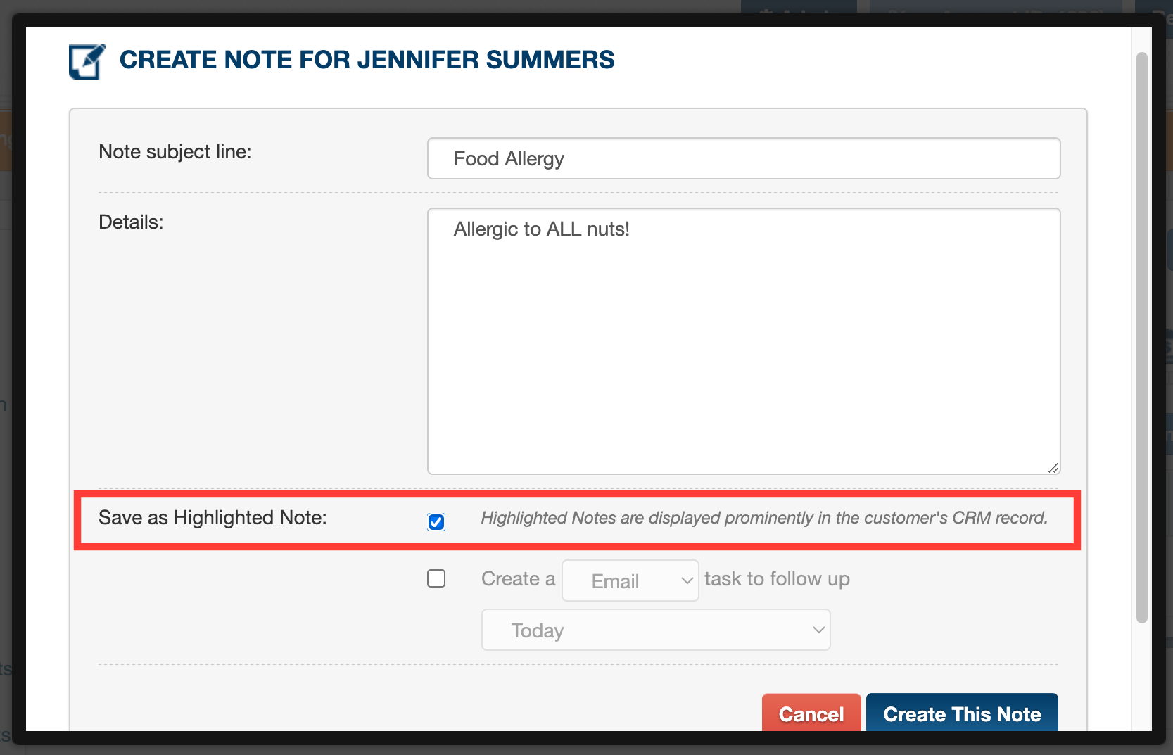 Enter a Note Subject Line and the Note Details (e.g., "Customer is allergic to shellfish" or "Prefers almond milk in coffee") and check the Highlighted Note box to mark it as a Highlighted Note.
